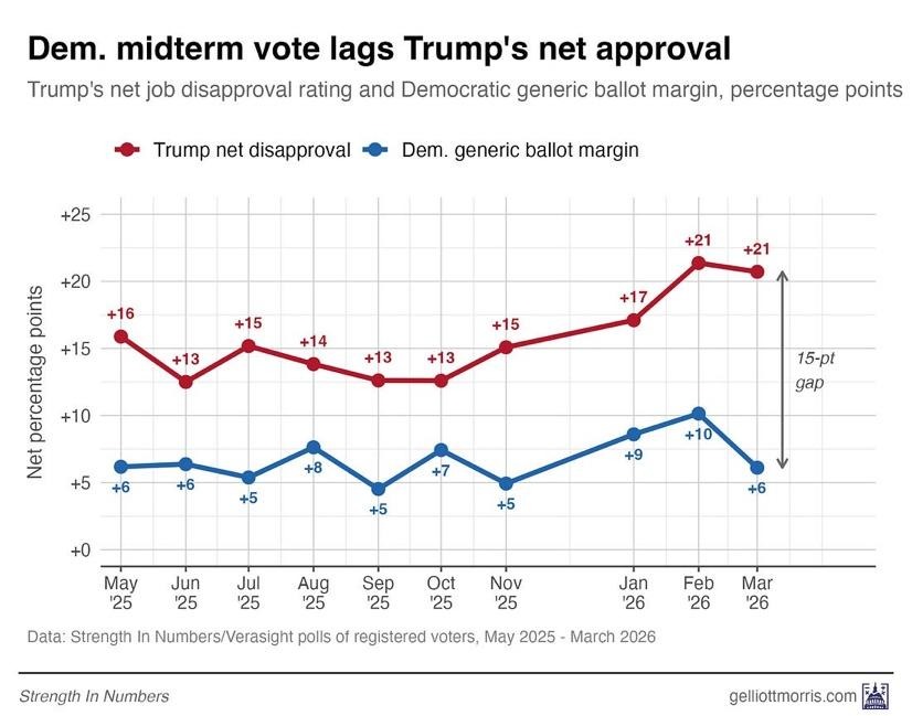 You can see the gap visually in a chart shared by G. Elliot Morris on his excellent “Strength in Numbers” Substack. There’s a 15-point gap between Donald Trump’s net negative disapproval and the Democratic Party’s advantage in the generic ballot question.