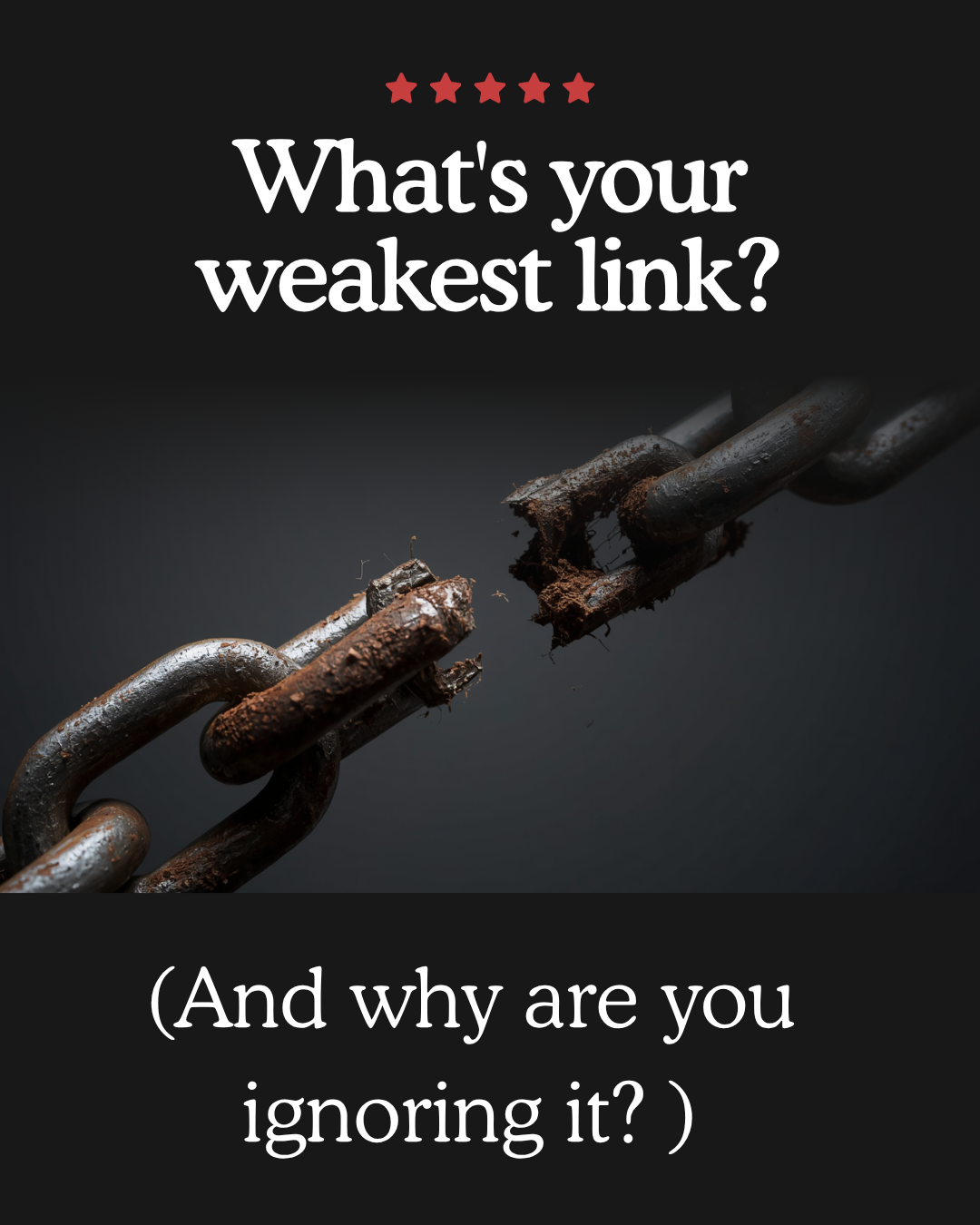 Whatever your weakest link is, there’s one thing I can tell you. Failing to identify it or deferring dealing with it is playing with fire.